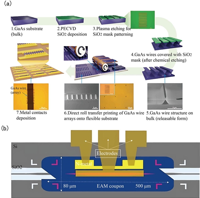 图5:(a)砷化镓光电探测器的制备与转印过程及相关光学与扫描电镜图像。(b)电吸收调制器的设计图图源:(a)Advanced Materials Technologies 7, (2022).(b) Applied Physics Letters 125, (2024)