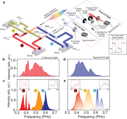 研究团队创新性地通过简并四波混频非线性过程,在紫外、可见及近红外光谱范围生成了飞秒级超短压缩光脉冲(如图1示意)。利用光场合成器将超连续谱分为三个光谱通道,经调控后聚焦于二氧化硅靶材产生压缩光,并通过改变相位匹配条件实现振幅与相位压缩的切换。这一成果突破了传统连续波激光压缩光的局限,首次实现多光谱范围超短脉冲压缩光的可控生成,为超快量子科学研究提供了关键工具。