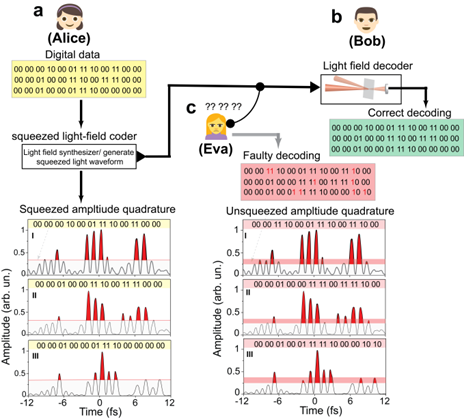 进一步地,研究团队提出基于超短压缩光的拍赫兹级安全量子通信协议(如图3协议示意)。利用光场合成器将数字数据编码到压缩光波形中,以近红外脉冲作为量子关联本地振荡器,通过动态调控延迟选择正交投影实现解码,并借助压缩光对窃听的敏感性及多重加密机制保障通信安全。该协议突破了传统连续变量量子密钥分发的速率限制,兼具高速与高安全性,为下一代量子通信网络提供了创新方案。