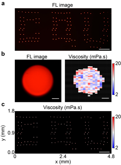 图2. 微滴激光器阵列。a,利用打印机制备的微滴阵列荧光图像。b,微滴阵列单个微滴的荧光图像与粘度图。c,微滴阵列粘度映射图。