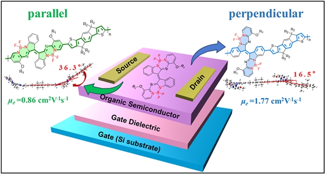 将吸电子的B←N配位单元引入共轭聚合物中,已成为增强n型电荷传输的有效策略。然而,这些单元的取向(垂直于或平行于聚合物主链)会深刻影响有效共轭、分子堆积以及最终的电荷传输性能。