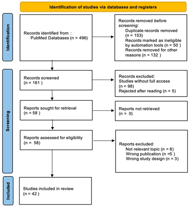 研究团队于2025年3月系统检索了PubMed数据库,且严格遵循PRISMA指南,纳入近5年发表的42项临床研究,通过标准化数据提取和四人独立筛选流程,全面评估了乌司奴单抗在克罗恩病治疗中的疗效、安全性及预测因素。