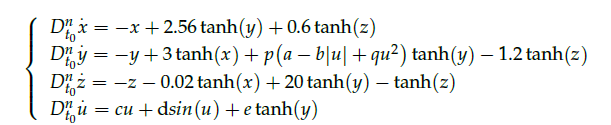 并通过 Adomian 分解法(ADM),令系统方程左侧为零,求解得到系统唯一零平衡点 (0,0,0,0),推导其雅可比矩阵与特征多项式,结合分数阶系统稳定性判据,验证了零平衡点在不同参数下均为稳定焦点,完成了系统平衡点的稳定性分析。