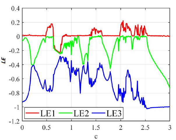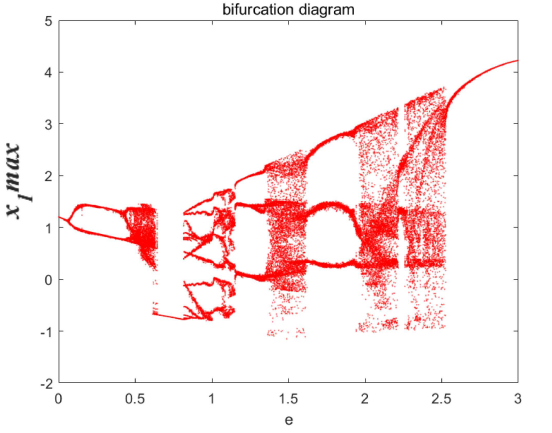 参数 e(0~3):e 在不同区间内,李雅普诺夫指数谱如下图2所示。在 0.63~1.38 区间无正李雅普诺夫指数,处于纯周期状态,2.25~2.56 区间混沌特性显著。