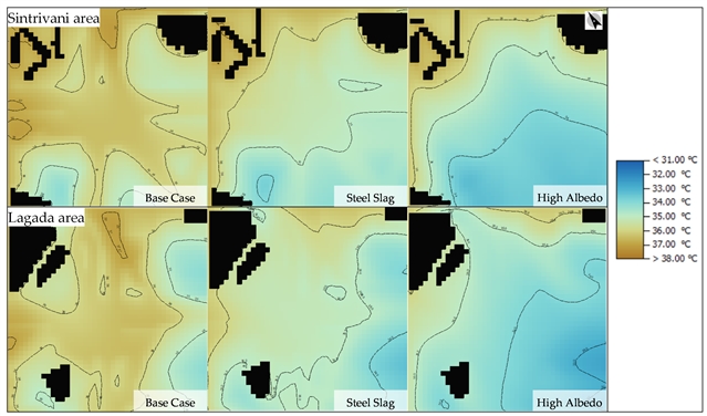 (1)本研究的目的是评估道路路面中使用的再生材料或废弃物对城市微气候的影响。通过模拟评估,对采用传统沥青和再生/废弃物混合料建造的城市路面表面温度与环境温度进行了分析。研究选取了希腊塞萨洛尼基市地铁站附近的两个大型街道交叉口作为案例,在三种情景下进行考察:传统热拌沥青、含钢渣的沥青混合料以及高反照率混合料。