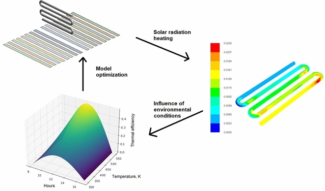 (2)研究聚焦于关键操作参数(包括浆料流速、温度、压力、停留时间及外部传热系数)对生物原油生产整体效率的影响。通过运用过程模拟原理和动力学模型,结合用户自定义函数(UDF)对多相系统中的热质动量交换进行分析,开展了详细的热力学评估,以解析水热液化反应中的质量与能量平衡。反应器的接收器为一根总长20米的铜质吸收管,采用自底部盘绕的构型设计以增强吸热效率。为优化生物质在水热液化过程中转化的热性能,采用计算流体动力学-离散单元法(CFD-DEM)耦合数值方法,研究仅通过太阳能获取热源以提升热性能的途径。该数值建模方法能够深入评估传热机制与流体-颗粒相互作用,确保高效能源利用与可持续工艺开发。