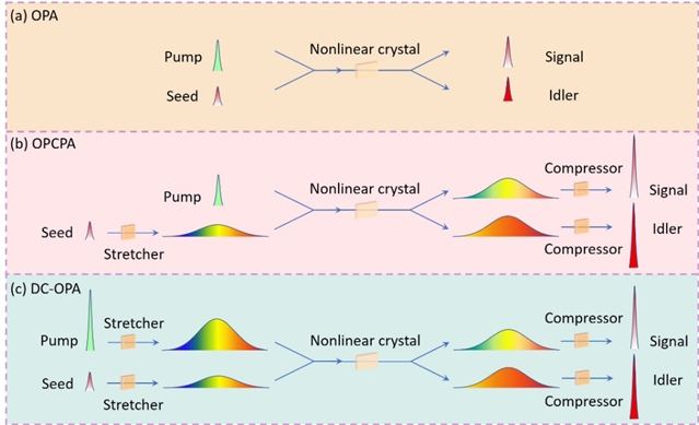 图2:(a)OPA原理图;(b)OPCPA原理图;(c)DC-OPA原理图