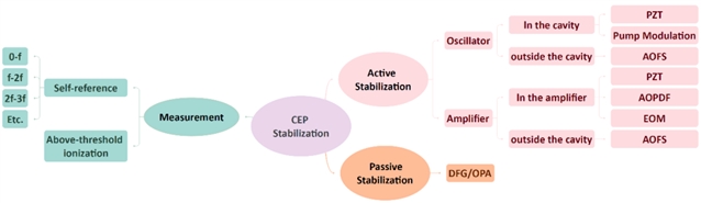 在CEP控制方面,必须利用f-2f干涉仪 (或0-f干涉仪)将光学频率转换为射频信号以测量CEP漂移,并结合主动反馈/前馈控制——包括调节振荡器泵浦/楔角片、利用声光移频器(AOFS)进行无腔内干扰的前馈稳定、以及在放大器中应用声光可编程色散滤波器(AOPDF)或光栅微调——或者利用基于差频(DFG)过程的被动全光自稳定机制,最终构建出波形精确可控的高能阿秒驱动源。