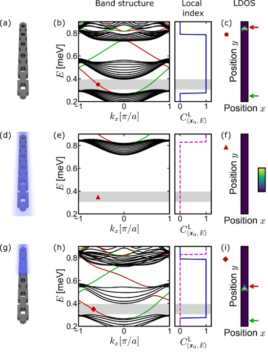 激子—极化激元系统固有的非线性特性,是诱发其晶格局部拓扑结构发生动态转变的核心诱因。以二维系统的带状几何结构为研究对象,未泵浦状态下,系统的带状能带结构不仅具有非平庸拓扑能隙,还存在相应的手性边界态(图2a-c)。然而,当引入激子库诱导的能量蓝移后,目标能量范围内的拓扑属性会随着能量分布改变而发生转变(图2d-f)。因此,若仅对晶格的一半区域施加非共振泵浦,则会形成 “泵浦区 - 未泵浦区” 的拓扑差异:仅泵浦区域在目标能量范围内呈现平庸拓扑特性,而未泵浦区域仍保持原有的非平庸拓扑属性(图 2g-i)。