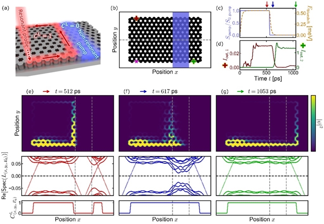 紧接着,研究人员展示了在极化激元晶格中实现可重构陈界面的典型系统(图3a和b)以及非共振泵浦下激子—极化激元晶格的完整时间演化过程(图3c-g)。结果发现,在晶格的外边缘区域,当晶格的拓扑属性由外部向内部变化时,与拓扑边界态相关的光谱定位子会出现一个本征值穿过零的现象,且该区域的局部陈数会同步从0跃迁为1。这一现象的物理根源在于:外边缘处的晶格本身具有非平庸拓扑特性,而其周围的真空区域为平庸拓扑态,两者的拓扑属性差异导致在过渡区出现“本征值穿零—陈数突变”的拓扑界面特征。