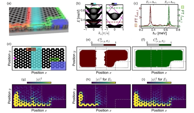 为阐述可重构多通道拓扑路由的实现原理,研究人员构建了典型的激子—极化激元晶格实验体系:通过施加两种不同振幅的非共振泵浦图案(图4a和d),在晶格中构建出多区域差异化拓扑结构;同时,利用单个探测光源在多个能量下激发拓扑边界态,模拟多通道信号的路由场景。结果显示,系统在较低和较高能量区间内,拓扑属性不同的区域具有不同的空间形态(图4e-f),基于此,沿此类界面传播的手性边界态会形成“拓扑边界共振态”,其核心机理在于:这些边界态虽在能量上与晶格体模存在重叠,但二者的波矢具有显著差异,这种 “能量重叠 - 波矢分离” 的特性使边界态能稳定局域于界面,进而形成共振效应。