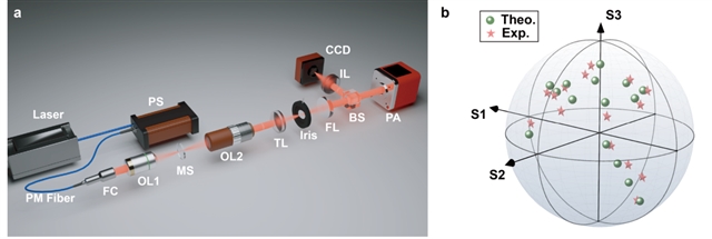 为了验证该理论,研究团队设计并制备了16个样品,分别实现了庞加莱球三个坐标(方位角、高度角、半径)的独立调控,生成不同的部分偏振光。实验系统如图4a所示,测试结果(图4b)显示理论预测与实验数据高度一致,验证了该策略的有效性与可行性。