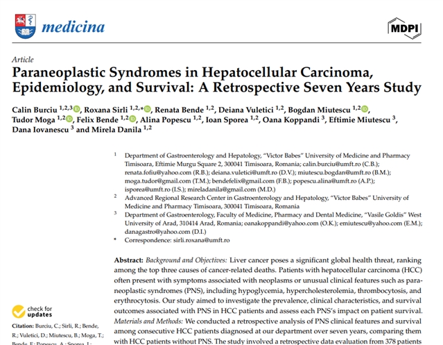 该回顾性研究分析了罗马尼亚蒂米什瓦拉县医院胃肠病诊所的378 例肝细胞癌患者,证实副肿瘤综合征与肝细胞癌不良预后相关,但并非独立预后因素。
