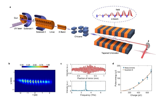 超短电子束的相干辐射机制有望解决这一难题。对于束团长度远小于辐射波长的超短电子束,其中每个电子的辐射场会产生相干叠加,使得辐射功率随电子束数目平方增长。利用周期性的超短电子束脉冲串,可以实现在其调制频率上的相干辐射增强。清华大学工程物理系颜立新团队2023年在Nature Photonics上报道了基于空间电荷力调制的电子束脉冲串实验,首次成功产生了1-10THz连续可调的电子束脉冲串。