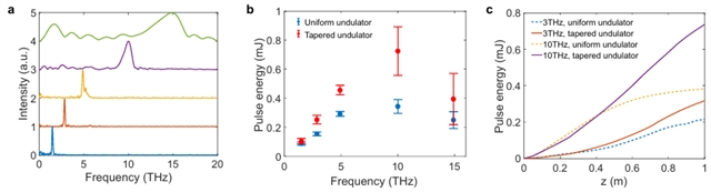 如图2所示,实验在平面波荡器构型下实现了1-20THz全频段百微焦量级的脉冲能量,在10 THz频点单脉冲能量达到390µJ,进一步采用渐变型波荡器后,单脉冲能量最高达到900µJ,是迄今为止在该频段窄带太赫兹源中获得的国际上最高辐射能量纪录。