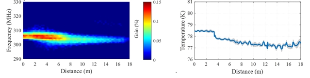 图2. 基于受激布里渊散射过程,使用充氖气(27 bar,~77 K)的空芯光纤进行分布式测温。(左图)布里渊增益谱。(右图)温度分布图(分辨率75厘米)。在光纤起始端附近可见一端3米长的高温区