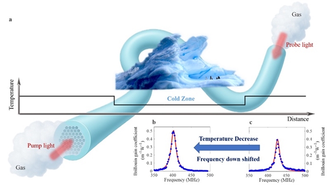 布里渊散射是一种光与声相互作用的物理过程,基于光纤的布里渊散射则通常被用来进行温度或应变测量。但在传统实芯石英光纤中,这种方法存在一个根本问题——材料本身“太复杂”:掺杂成分不同,内部残余应力不可控,且在低温下的声学响应关系不再单调。这意味着,基于传统石英光纤的温度测量必须提前标定,且只能测“相对变化”。因此研究人员将目光转向了气体。