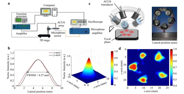 (a 单个 ACUS 换能器声压力场测量装置示意图;b 单个换能器焦平面的归一化声压分布;c ACUS 阵列及 3D 打印固定环的 结构示意图及实物图像;d 五个换能器阵列在 xy 焦平面产生的归一化声压分布。)