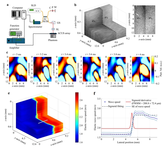 研究团队系统表征了单个及多换能器阵列产生的声压分布,结果表明:五换能器阵列能够在样品区域内形成稳定且相对均匀的混响声场。结合相位敏感光谱域 OCT(PhS-SDOCT),作者成功获取了组织内部多时刻的轴向粒子速度分布,并基于标准 Rev-OCE 自相关分析模型,定量反演剪切波速度。