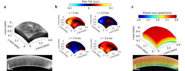 为进一步验证该方法在真实生物组织中的适用性,作者进一步在ex vivo猪角膜 样本上开展实验,在不接触角膜,不用水或凝胶等耦合介质的情况下,仅通过空气超声激励对角膜进行力学成像。