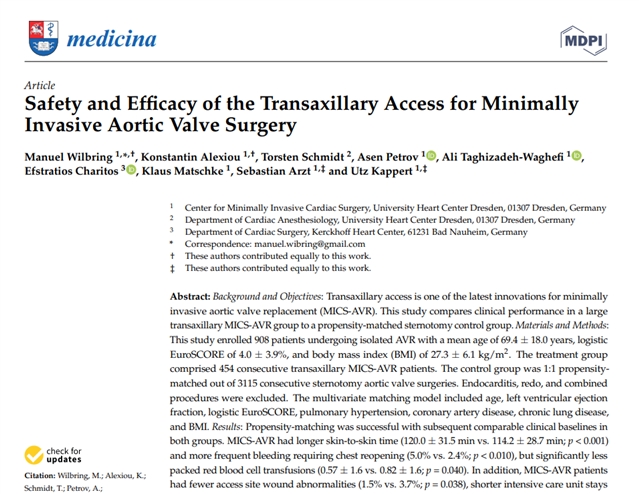 该单中心回顾性研究对比德国德累斯顿大学心脏中心 454 例经腋窝微创主动脉瓣置换术与 454 例传统胸骨切开术患者的疗效与安全性,证实经腋窝微创主动脉瓣置换术安全有效,且术后恢复更优。