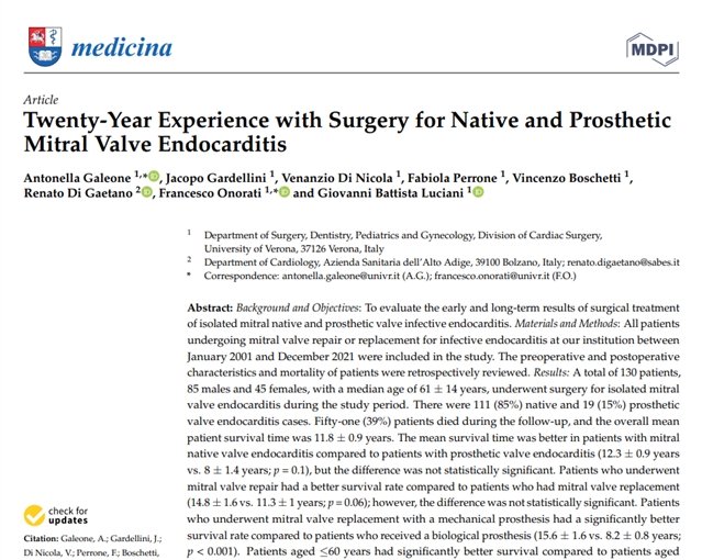 本文回顾性分析意大利维罗纳大学医院 2001-2021 年 20 年间 130 例孤立性自体(111 例)与人工(19 例)二尖瓣感染性心内膜炎患者的手术治疗数据,证实二尖瓣修复应作为合适感染性心内膜炎患者的优先选择,且患者年龄对预后影响显著。