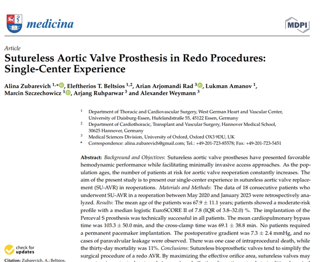 本文回顾性分析德国杜伊斯堡 - 埃森大学西德心脏血管中心18 例接受无缝合主动脉瓣置换术的二次手术患者数据,证实无缝合主动脉瓣置换术在二次主动脉瓣手术中安全有效,可作为传统手术及经导管瓣中瓣的替代选择。