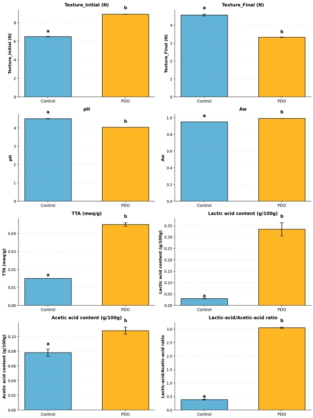 图2. 对照(酵母)与PDO(酸面团)面包样品理化及质构特性的柱状图(n = 4),误差线表示标准差。同一行中不同上标字母(a、b)表示根据Tukey’s HSD事后检验(p < 0.05)处理之间存在显著差异。