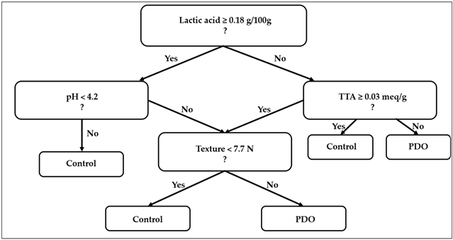 图3. 决策树模型,用于总结PDO(酸面团)与对照组(酵母)面包样品保质期分类的理化预测因子。根节点:定义整体分离的起始变量(乳酸)。内部节点:基于pH、总滴定酸度(TTA)或质构阈值的次级判别。终端节点:预测类别(PDO或对照组),并标注样本数量(n)及分类准确率(%)。是/否分支:表示每次分裂的阈值判断方向。“?”表示来自随机森林决策树的判定根节点。