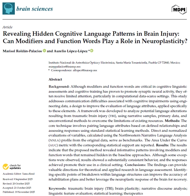 Roldán-Palacios, M.; López-López, A. Revealing Hidden Cognitive Language Patterns in Brain Injury: Can Modifiers and Function Words Play a Role in Neuroplasticity? Brain Sci. 2025, 15, 1239.