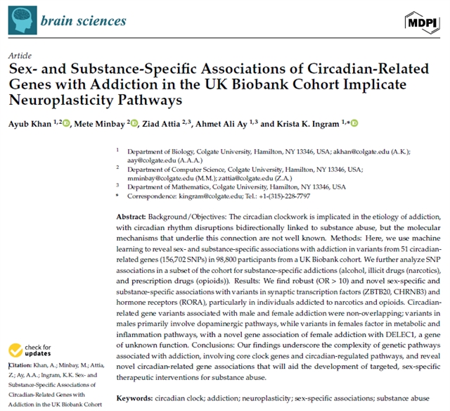 Khan, A.; Minbay, M.; Attia, Z.; Ay, A.A.; Ingram, K.K. Sex- and Substance-Specific Associations of Circadian-Related Genes with Addiction in the UK Biobank Cohort Implicate Neuroplasticity Pathways. Brain Sci. 2024, 14, 1282.