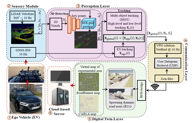 第一层次是实时感知层。感知管道由以下三个阶段组成,每个阶段均将其输出传递至下一阶段:首先通过 Velodyne 激光雷达传感器获取车辆周围 360 度的原始点云数据;其次利用 3D 检测模型(PV-RCNN深度学习模型)对体素化的点云进行处理,实现高精度的 3D 目标检测,输出包含目标位置、尺寸、朝向、速度和类别等信息的 3D 边界框;最后一阶段为多阶段跟踪,为了在不同序列之间保持时间一致性和可靠的对象身份,采用了两部分的跟踪模块——自车跟踪(定位)和多目标跟踪(MOT)。整个感知层基于 ROS 框架构建,为后续的通信与数字孪生同步提供可靠的数据基础。