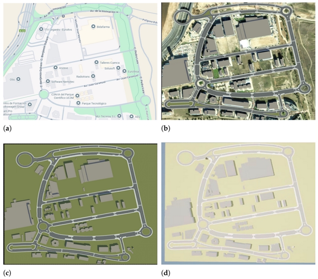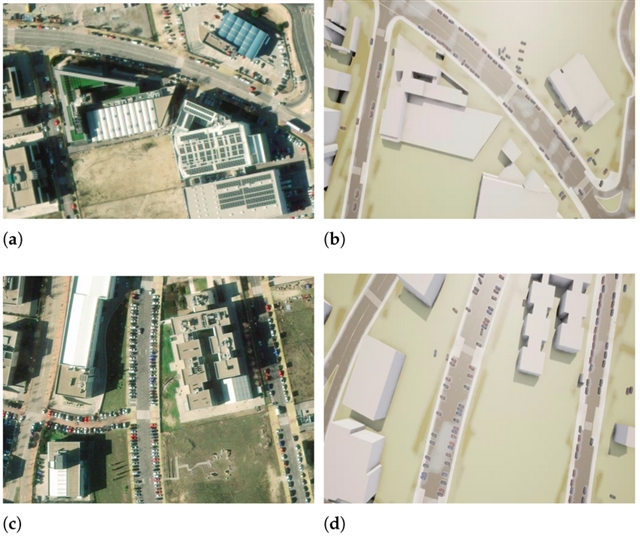 实验区域内所选街道的 ArcGIS 卫星影像与 CARLA 虚拟地图对比