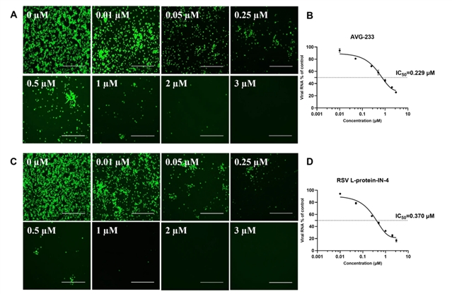 研究团队进一步在真实RSV感染模型中验证了上述结果,发现两种小分子抑制剂同样可剂量依赖性地减少感染并抑制病毒基因组复制,说明双报告微型基因组系统的检测结果与真实病毒抑制效应具有良好一致性。