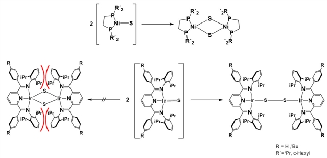 图1. 双核镍(上)与铱(下)二硫桥配合物的形成(红色弧线标示了金属–硫结构单元周围位阻显著拥挤的区域)