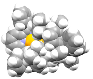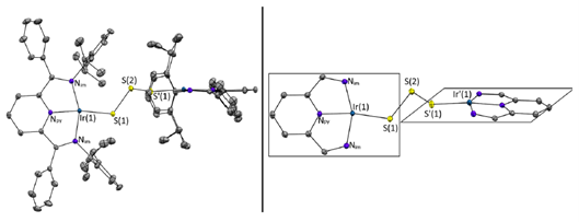 图3. 化合物3的分子结构Ortep图。左:为清晰起见,省略氢原子,热椭球以50%概率水平绘制。右:为进一步简化图示,还省略了芳基和苯基。(碳原子,灰色;氮原子,蓝色;铱原子,青绿色;硫原子,黄色。)