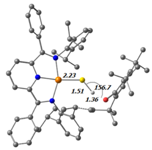 图4. 配合物1与TTBP自由基反应过渡态的计算结构:Ir–S–H + •O–(2,4,6-tBu)Ph → IrS• + H–O–(2,4,6-tBu)Ph。图中标注了部分关键键长(Å)和键角(°)