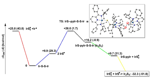 研究团队随后提出:这个Ir–S•中间体应当很容易先二聚成Ir–S2–Ir,因为对应的DFT结果显示这一过程几乎无势垒,而且热力学上有利。也就是说,Ir–S2–Ir更像是一个很快形成的早期中间体,而不是最终停留的终点(图6)。