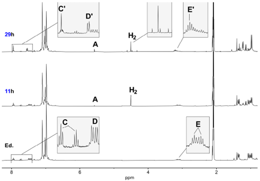 图8. 化合物3在甲苯-d8中、氢气存在下热解反应的1H NMR谱(300 MHz)。底图为配合物3(反应底物)的谱图;中图为加入氢气后在80 °C下反应11 h的谱图;上图为在80 °C下反应29 h后的谱图。A = SH,C/C′ = H-py,D/D′ = H-2,6-ph,E/E′ = H-1-dipp