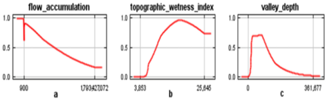 图2. 响应曲线显示了 (a) 水流累积量、(b) 地形湿度指数以及 (c) 河谷深度 对河狸坝存在概率的影响