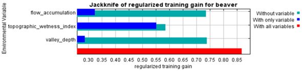 基于MaxEnt的物种分布模型展现了优异的预测能力。研究发现,地形湿度指数是影响河狸筑坝选址的最重要因素,其贡献率高达55.7%,表明河狸偏好土壤湿度高、水分汇聚的区域。其次是河谷深度(贡献率21.7%)和水流累积量。
