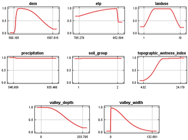 图4. 河道宽度、年降水量、潜在蒸散发、河谷深度以及地形湿度指数对河狸坝出现概率影响的响应曲线