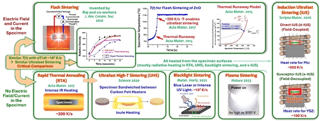 上图展示了从闪烧(Flash Sintering)的机理研究,到发展一系列无需电场的超快烧结技术的演变。 作者研究小组在2015年的机理研究表明,闪烧(Flash Sintering)过程可由热–电耦合失控(coupled thermal-electrical runaway)触发。作者研究小组在2017年的后续研究进一步证明,即使不施加电场,仅依赖超快升温同样能够实现类似的超快致密化过程。这一机理为进一步发展一系列普适的快速烧结方法提供了可行性。这一系列快速烧结方法使用不同的红外辐射(RTA),碳毡电阻/焦耳(UHS),蓝色激光或强紫外线辐射(Blacklight Sintering),等离子体(Plasma Sintering),和直接或受感体间接射频电感(IUS)加热,但都基于2017年发现的超高升温率导致的超快烧结机理。