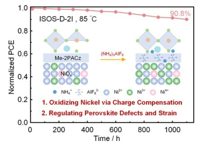 研究组引入六氟铝酸铵作为多功能界面层,以调和这一矛盾并调控埋底钙钛矿界面。他们阐明了一种电荷补偿机制:AlF63-阴离子通过F-离子与表面Ni2+配位,同时NH4+阳离子填充镍空位。这些过程协同促进了Ni3+的生成,从而在不引发寄生反应的前提下提升电导率。