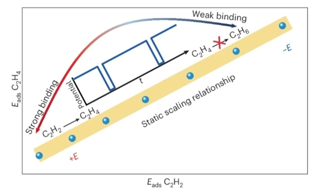 在乙炔加氢过程中,极化正偏压时处于强结合态,而在乙烯生成过程中,极化负偏压时切换为弱结合态,这种交替有效地抑制了过度加氢,同时保持了半加氢活性。这项工作确立了动态电表面调控可作为一种解耦吸附能关联的强大策略,以改善多相催化及其他吸附介导的过程。