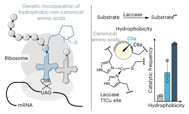 研究组设计了一对氨酰-tRNA合成酶/tRNA体系,用于对一组体积庞大、疏水性强的氨基酸(即环戊基丙氨酸、环己基丙氨酸和环庚基丙氨酸)进行位点特异性遗传编码。作为概念验证,研究组展示了基于非天然氨基酸的疏水调控在工程化细菌漆酶中的实用性——漆酶既是一种典型的金属酶,也是工业过程中具有高价值的催化剂。