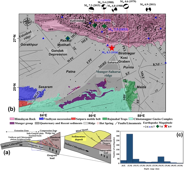 研究结果表明,蒙格尔-萨哈尔萨脊(MSR)从中新世至今一直控制着IGFB东段的沉降。此外,研究组在甘达克凹陷发现了一条隐伏断层,其断层活动可能由喜马拉雅楔体向南传播或下地壳的挤压弯曲所驱动。研究组还提出,蒙格尔-萨哈尔萨脊与地壳弯曲共同作用,在调节IGFB东段的地震活动性方面发挥着重要作用。