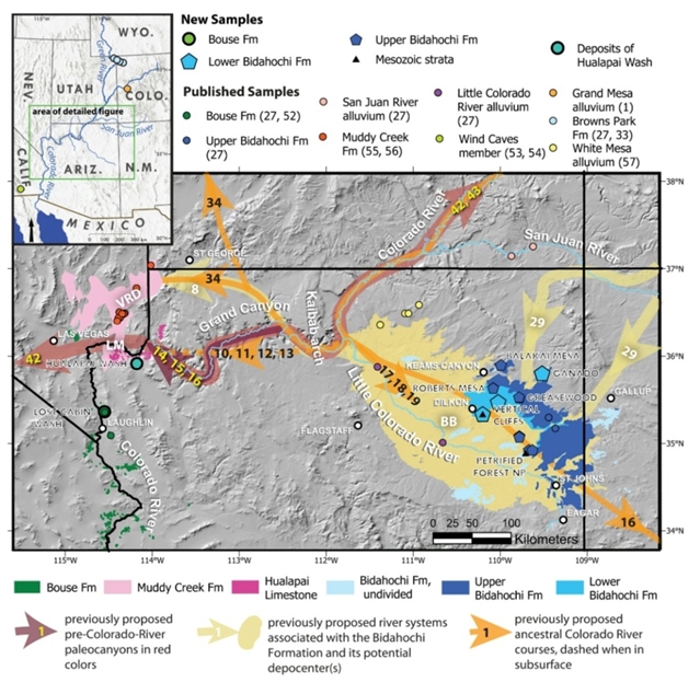 研究组利用锆石铀-铅年代学提供了新的证据,表明源自布朗斯帕克组的独特科罗拉多河-格林河沉积物,在660万年前就已到达比达霍奇盆地。与此同时,沉积速率出现了一个数量级的增加,碳酸盐锶同位素(87Sr/86Sr)比值升高,出现了快速水流环境特有的大型鱼类物种,并伴随有其他沉积学变化。这些证据与科罗拉多河在通过大峡谷贯通整合之前就已经向比达霍奇盆地供水并输送沉积物的推论相一致。