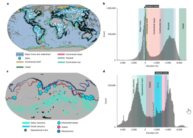 研究组探究一个曾经拥有海洋的行星是否应留下可识别的海岸线。他们表明,在地球上,全球性海洋最显著的地形特征并非海岸线,而是一个由海岸平原和大陆架组成的低坡度、低曲率值带状区域,其高程范围为-410米至-15米。将类似的分析应用于火星表面时,研究组观察到一个高程约在-1,800米至-3,800米之间的相对平坦带,这可能代表了一个部分保存下来的火星海岸架。