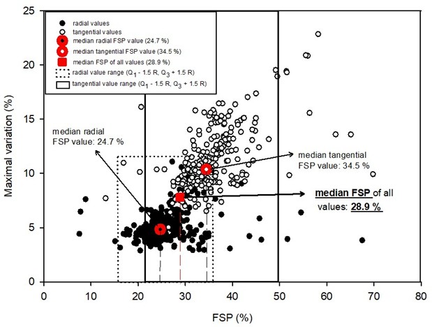 图2. 剔除异常数据后,确定了中值。虚线表示横坐标上的 FSP 值,包括径向和切向值的中位数以及所有数据的中位数。